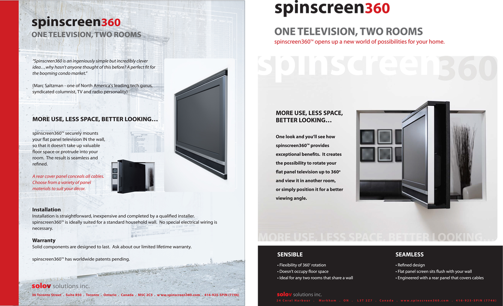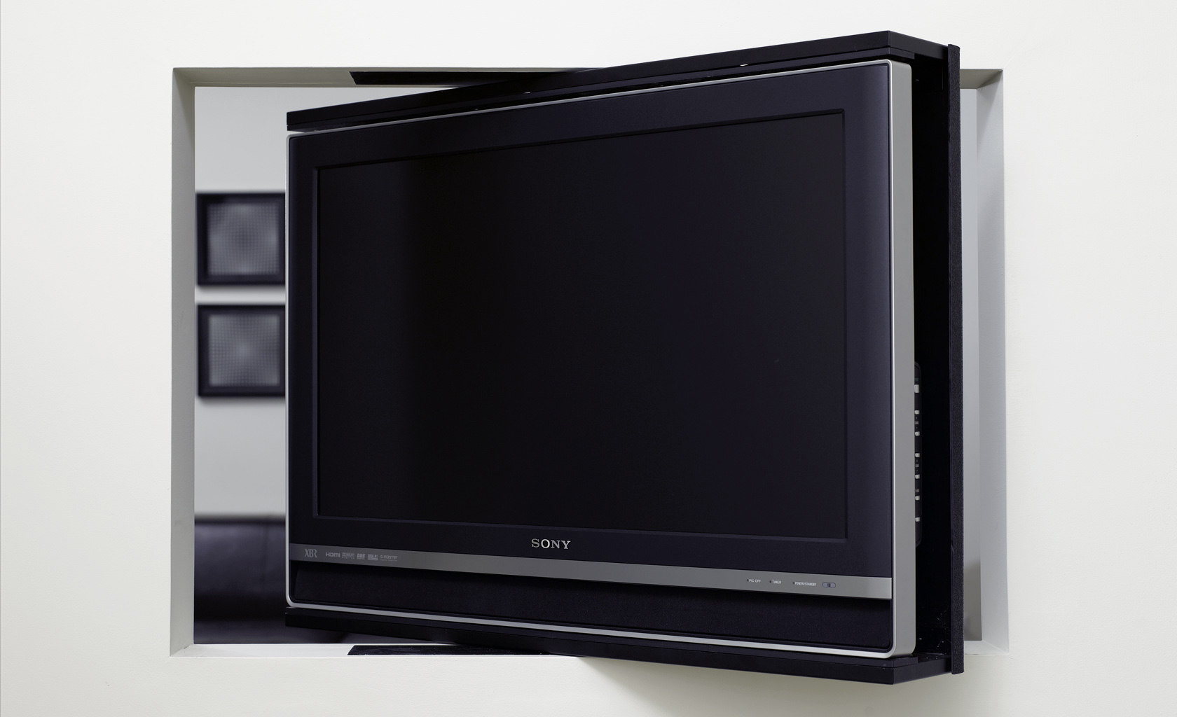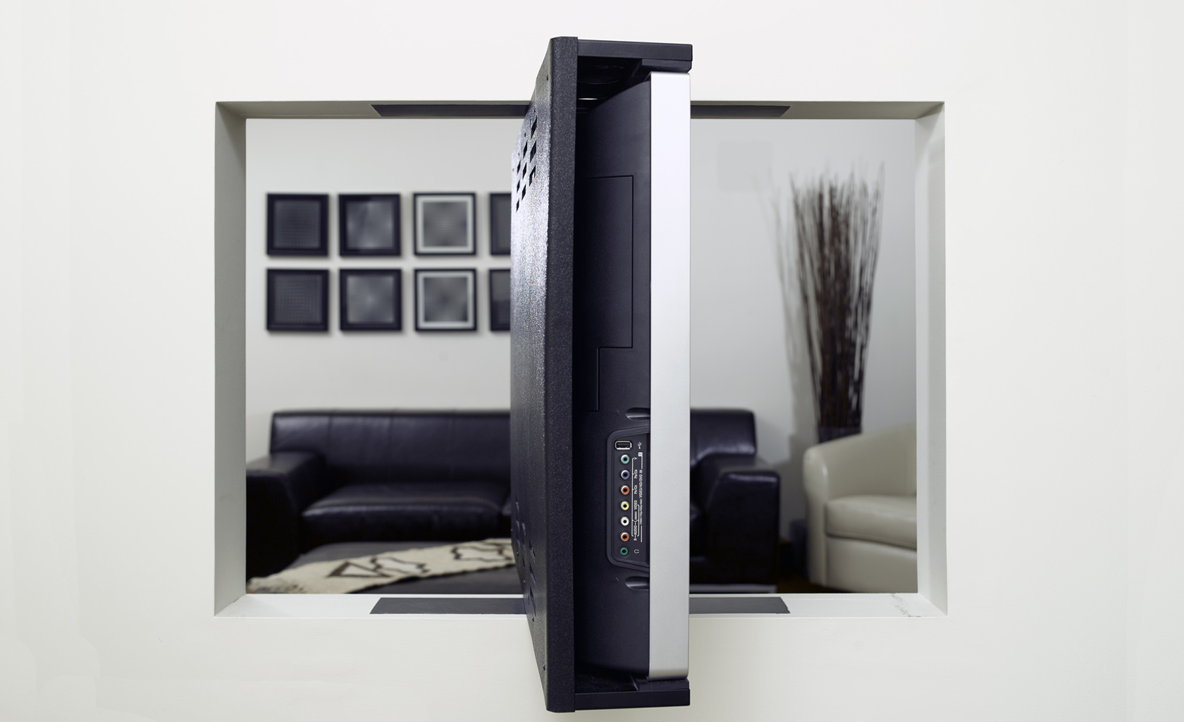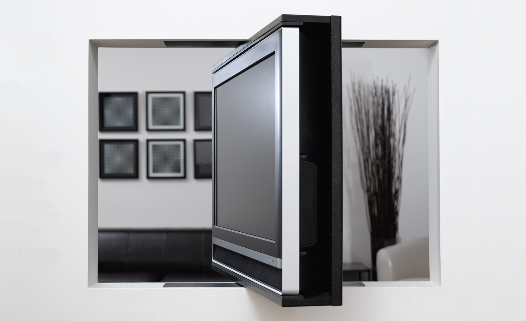 Concept ''One TV in Two Rooms'' executed for a Start Up company in the early stages of flat LCD and Plasma screens. Modular design providing necessary flexibility for various screen sizes, as well for different interiors including SS finish for in the kitchen option.