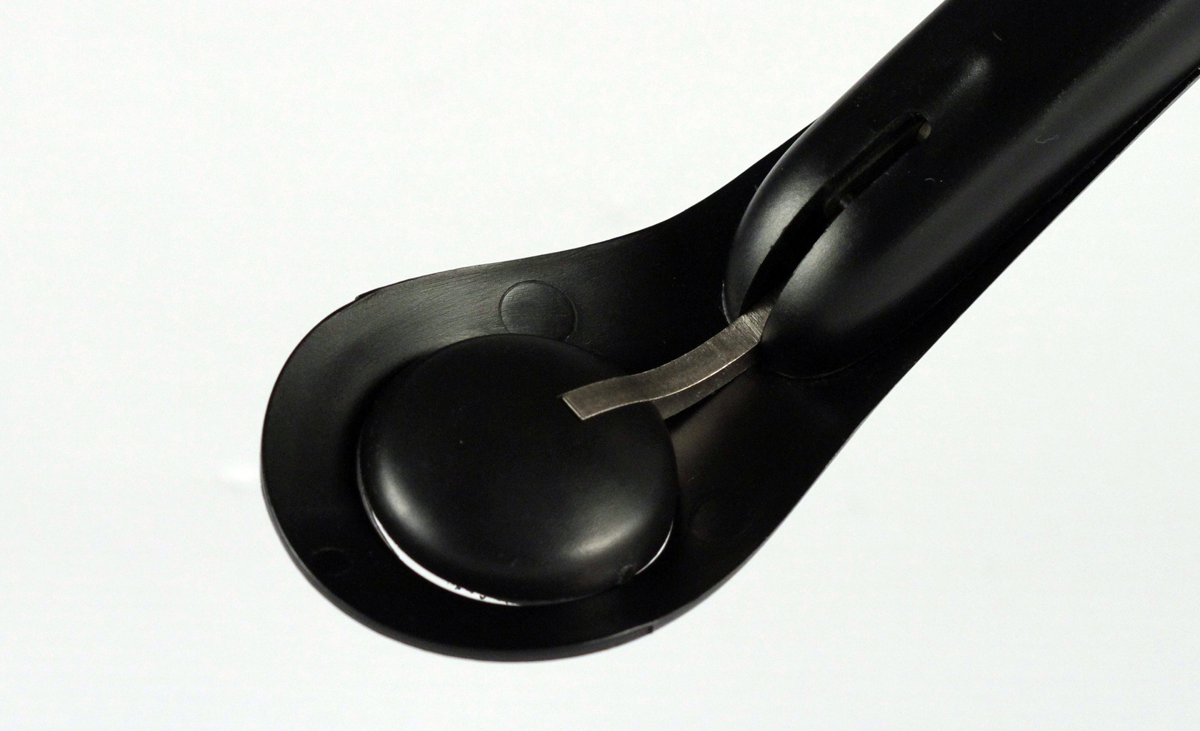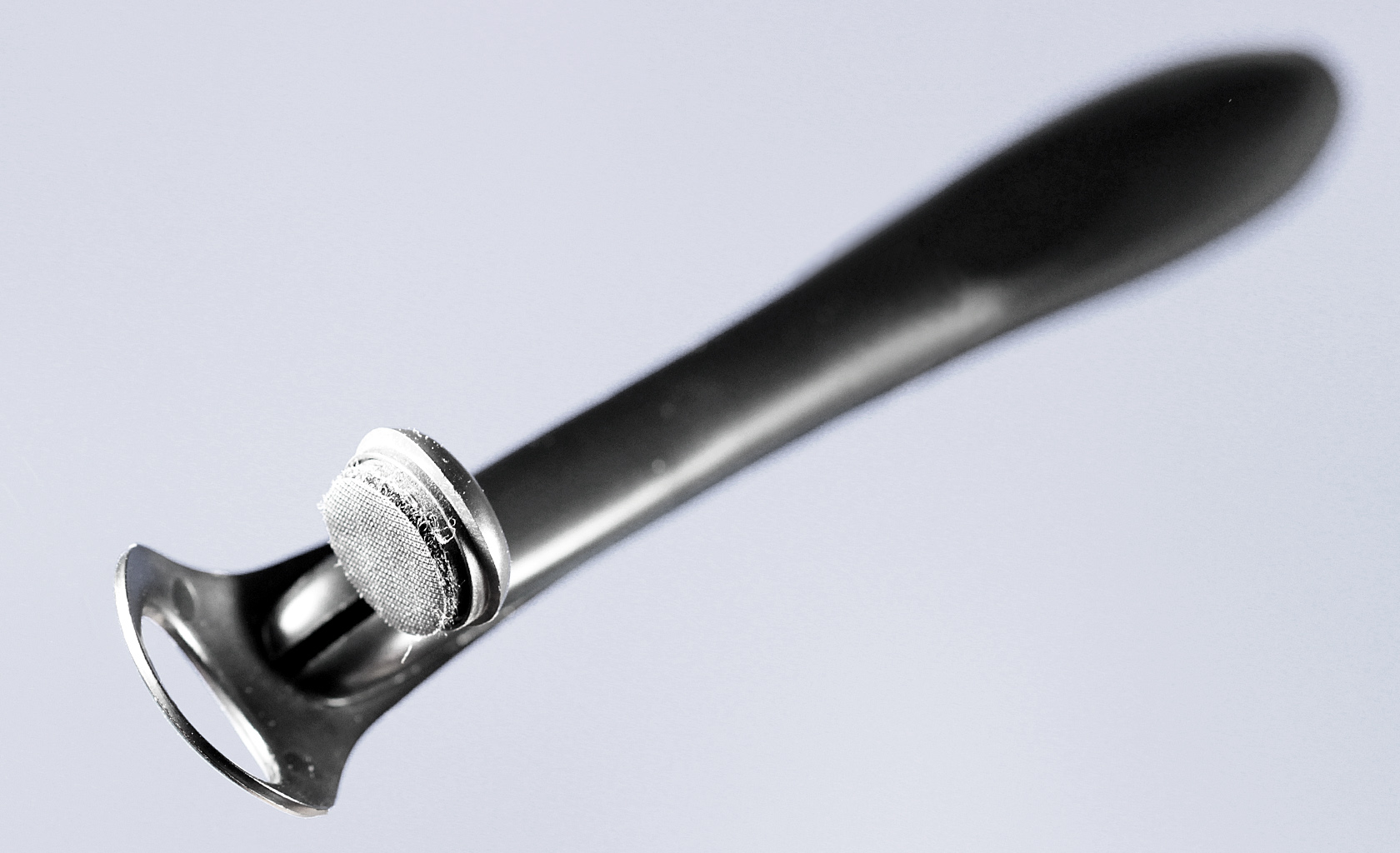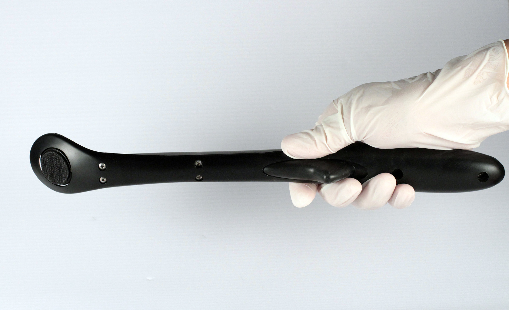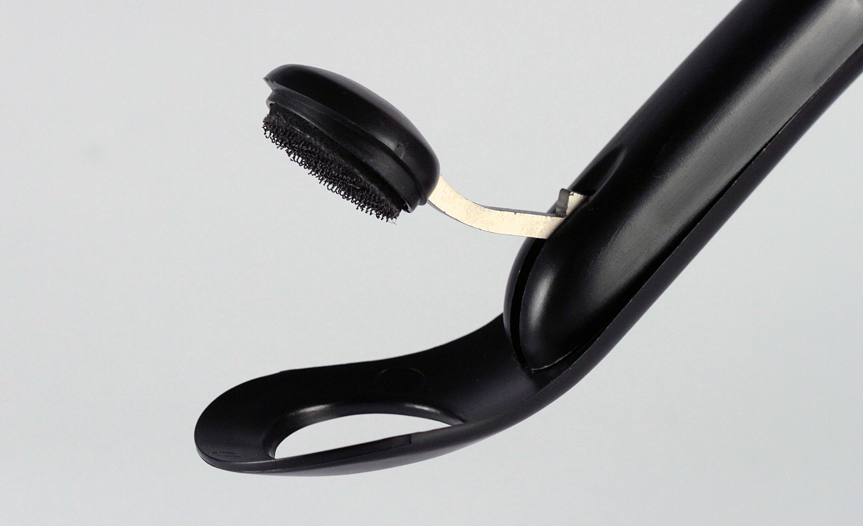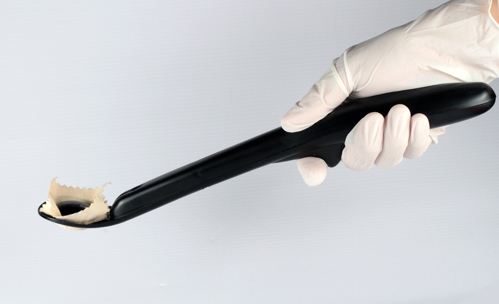 Sampling tool used at airports in conjunction with detection instrument is designed for continuous single hand operation. Ergonomic design prevents strain even with extensive use. Mechanism for hammer auto locking when in closed position. Design for medium size production, dish-washer safe and with replaceable 'Velcro' tip pads.