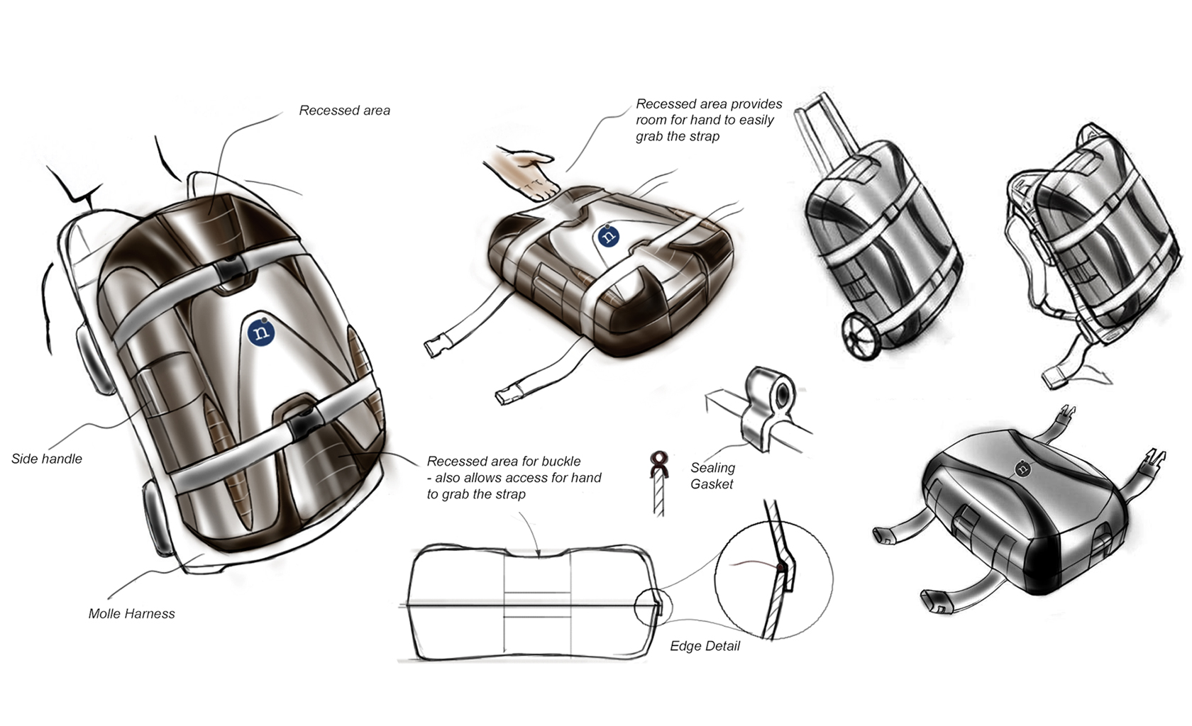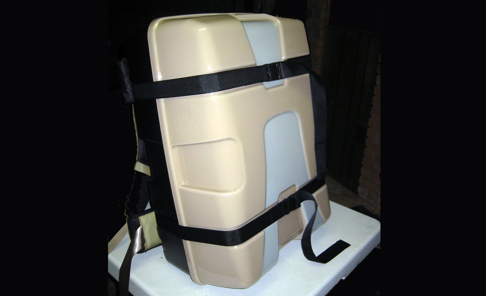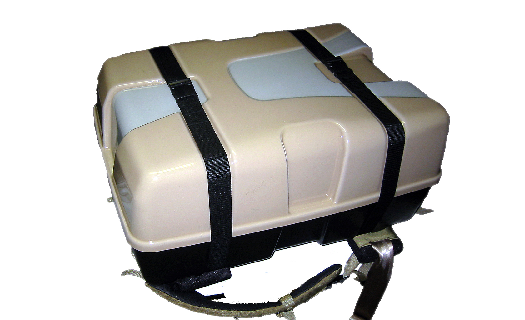 Ultra light, waterproof packaging solution for portable satellite communication and military electronics packaging solution, used for human transport alone or in combination with military Molle harness, Vibration and 40 G impact resistant, IP 67, floating, stackable, design and tooling executed in extremely short time.