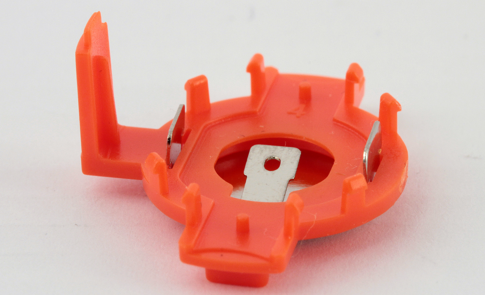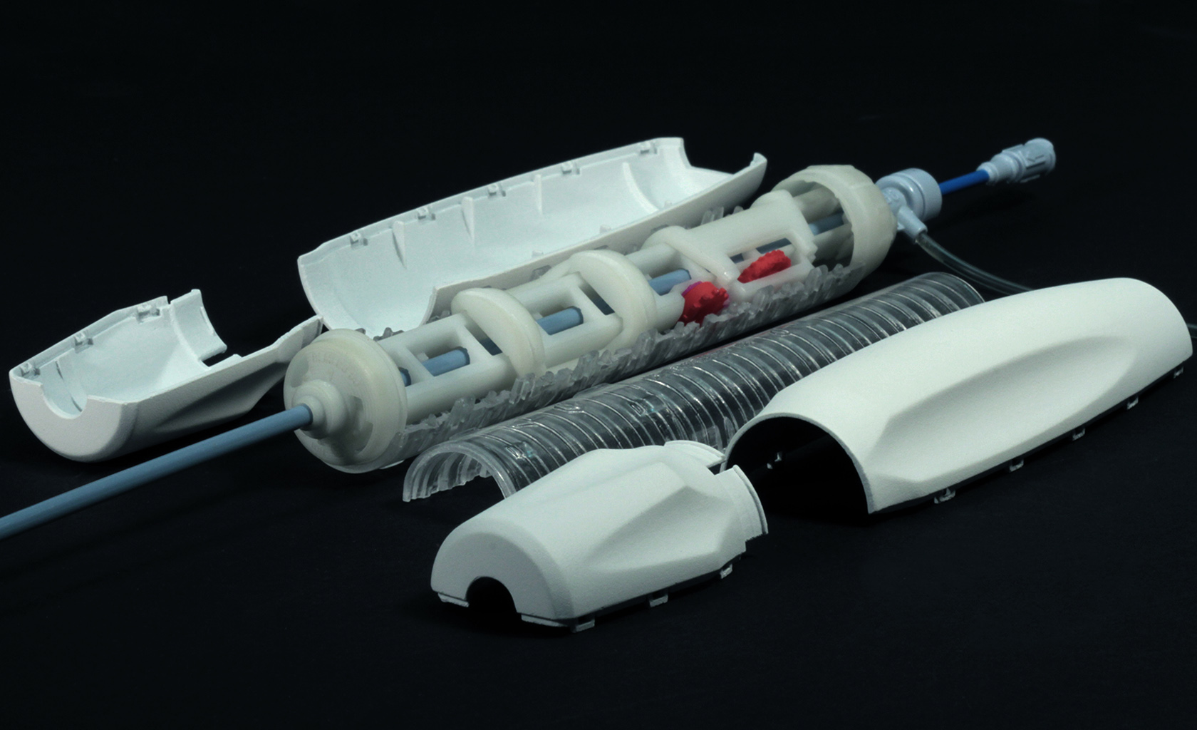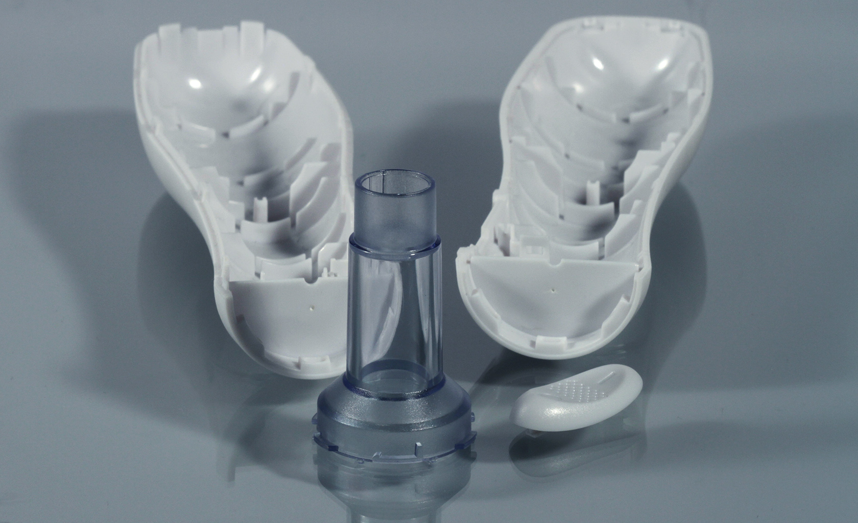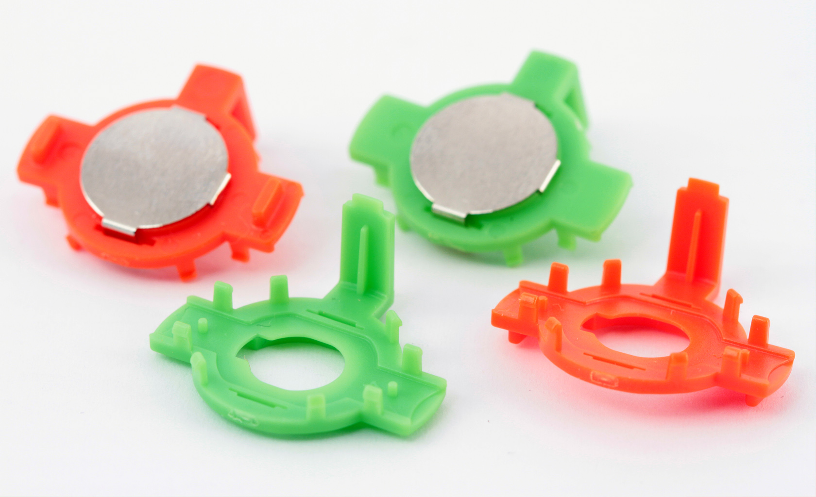 Miniature parts for high tech devices. Injection molded parts with micro snap on features for high volume production, miniature sheet metal electrical contacts and assembly features, TIR lens, springs etc. all going in one small sub assembly.
